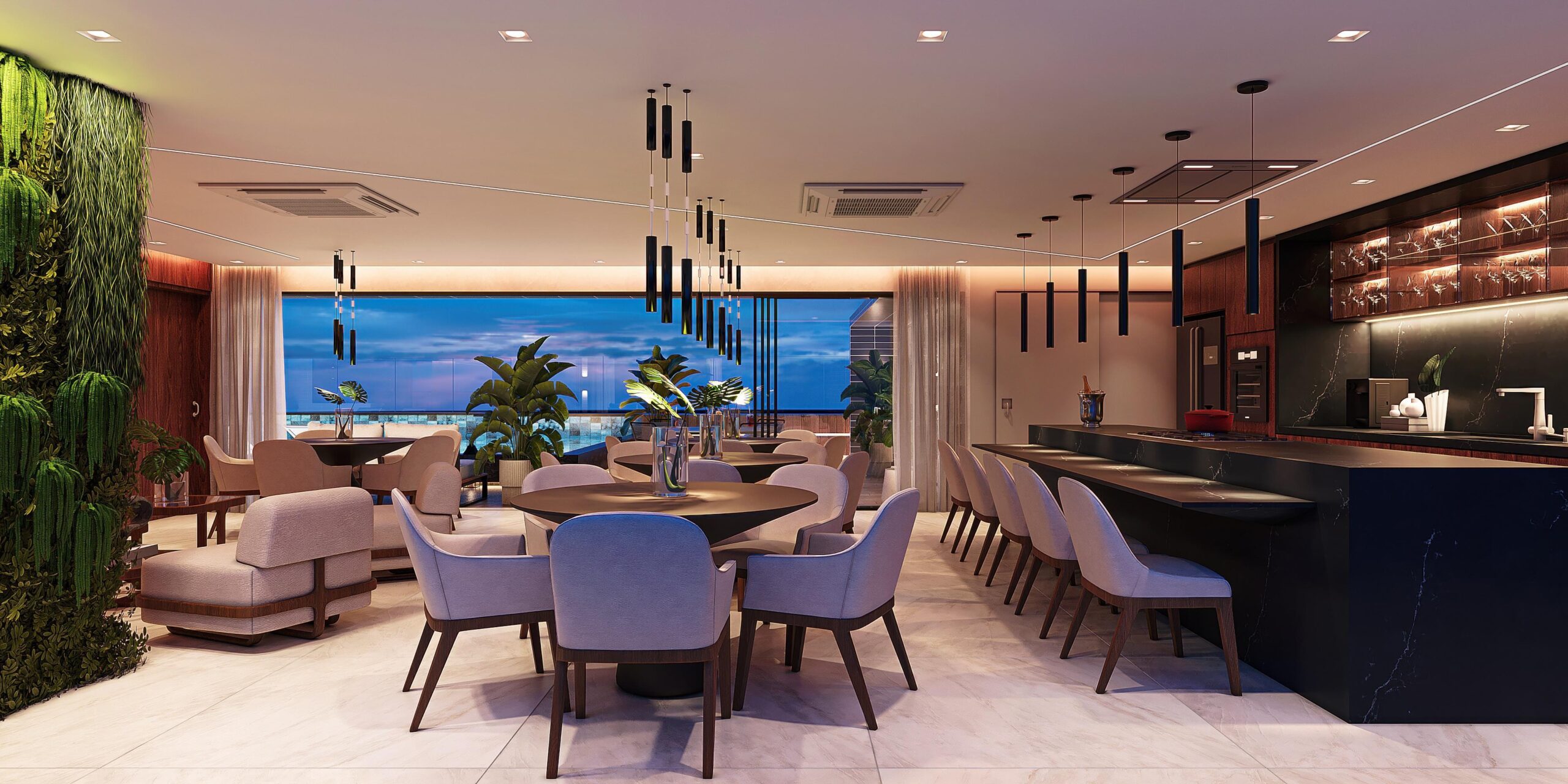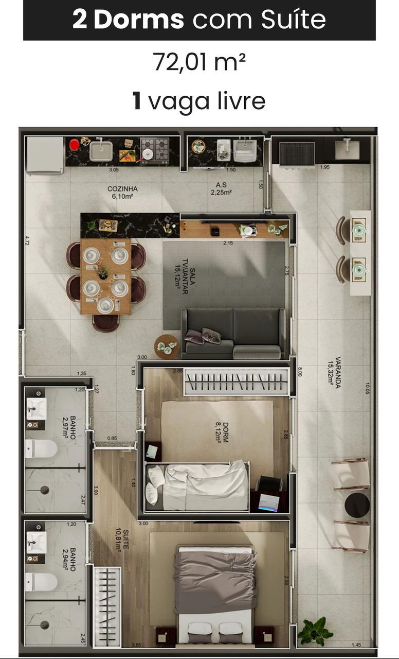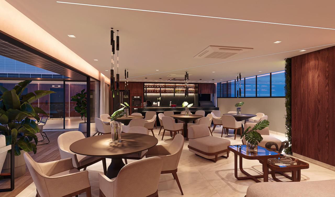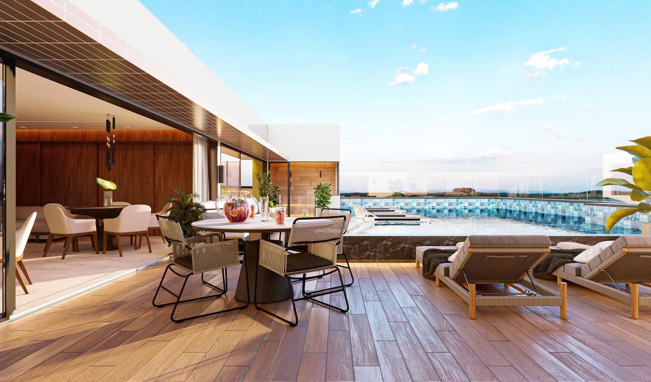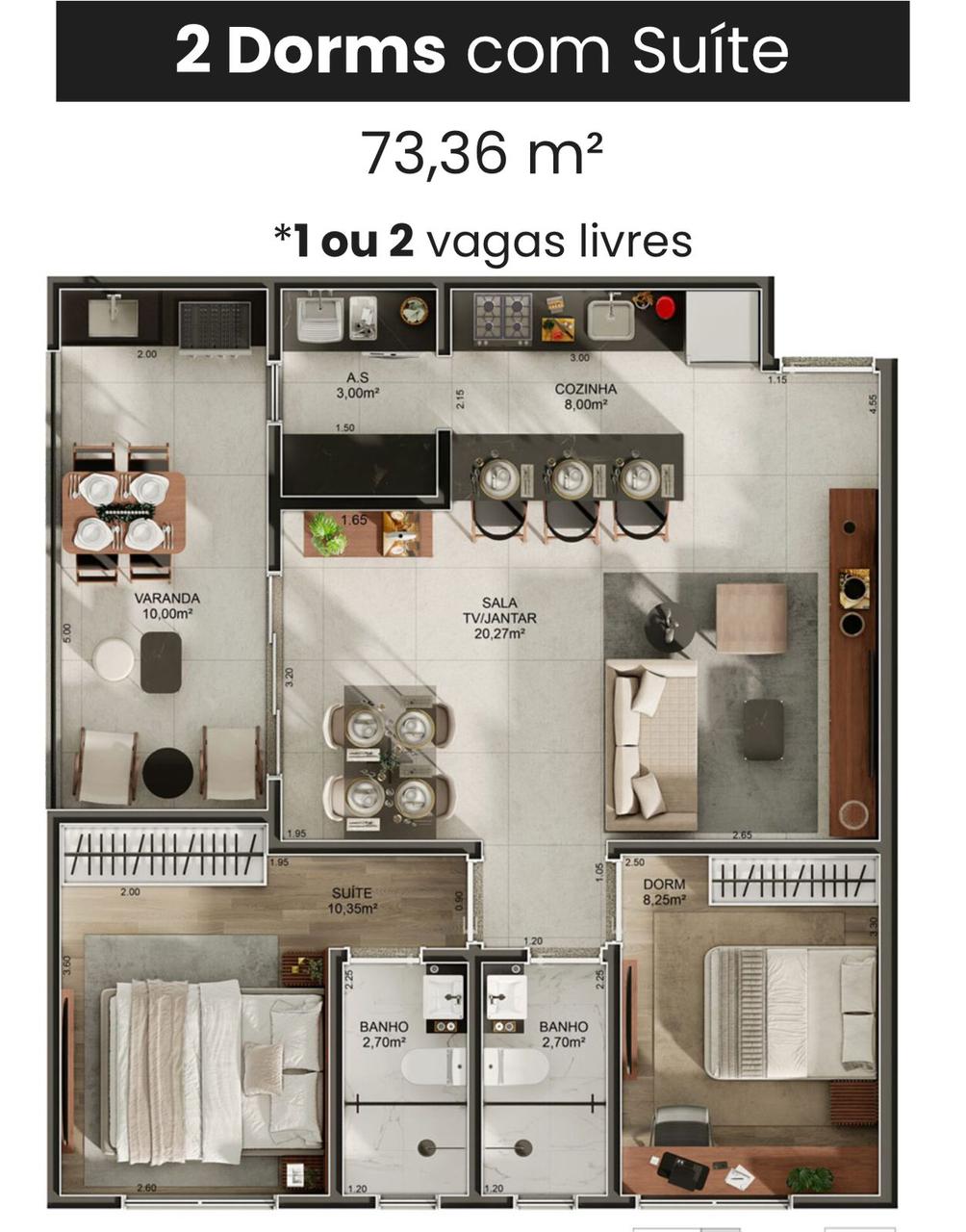 Empreendimento de torre única com apartamentos de 2 dormitórios, de 71 e 72 m², com 1 ou 2 vagas de garagem.