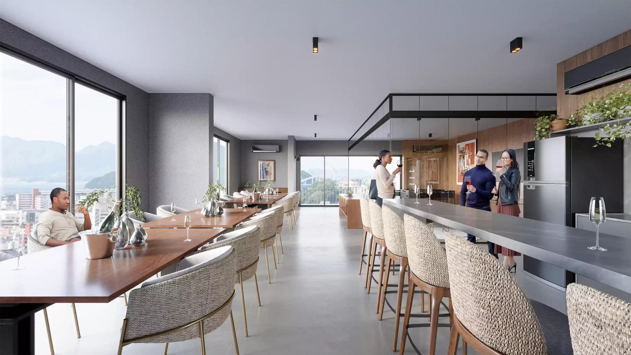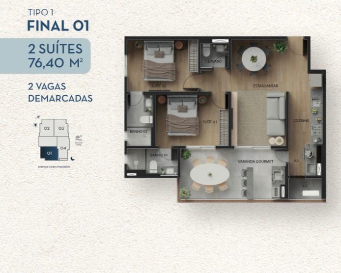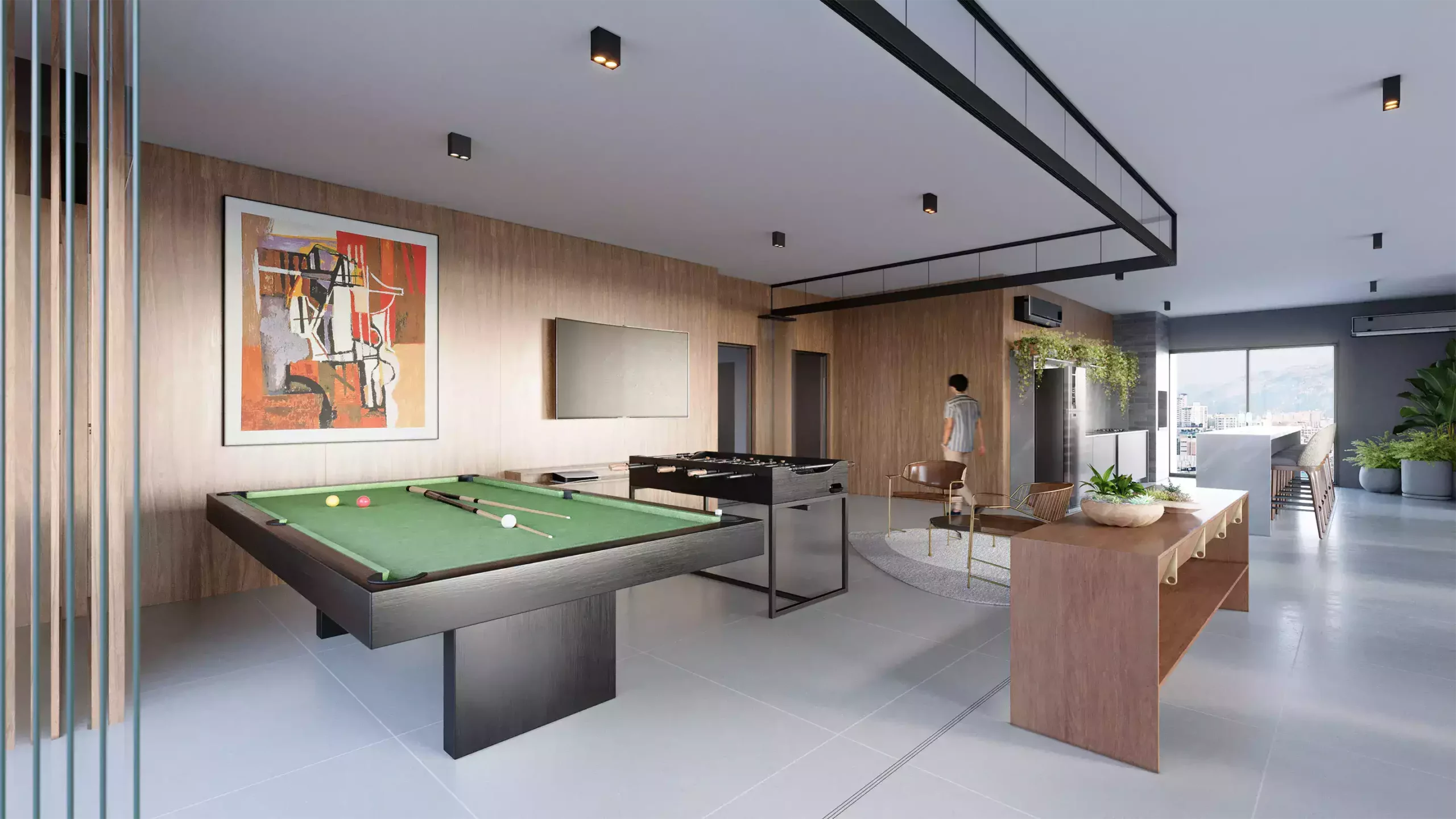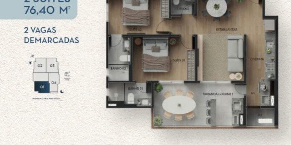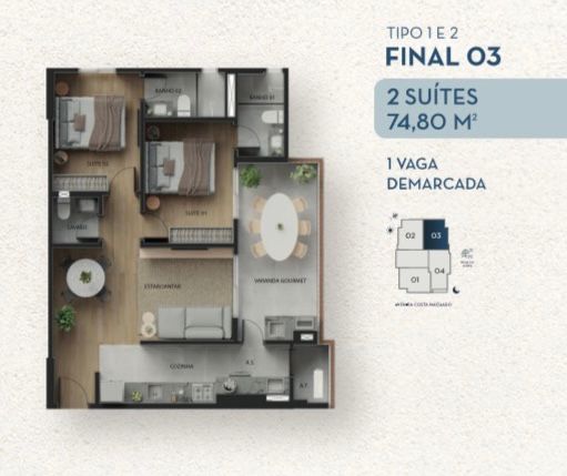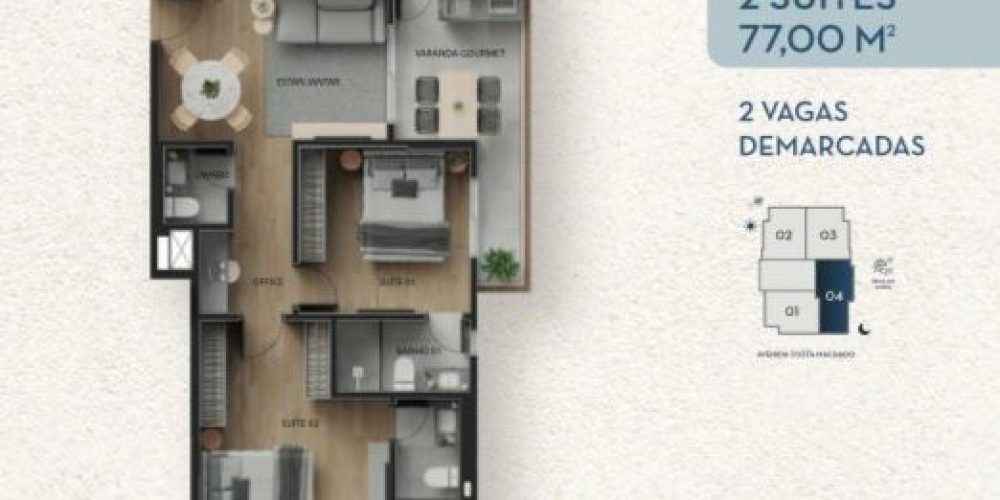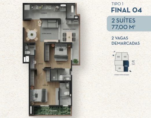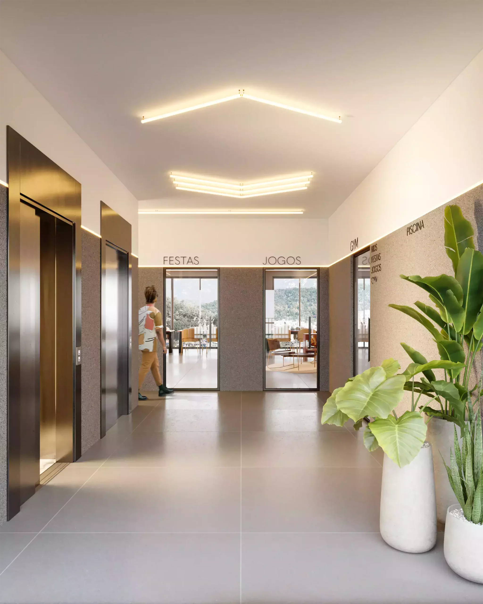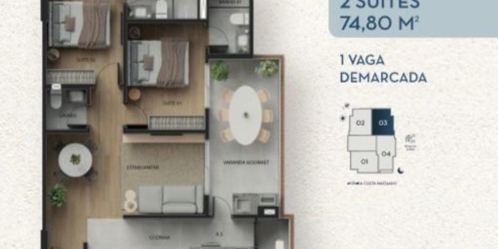 Empreendimento de torre única com apartamentos de 1, 2 e 3 dormitórios, de 74 a 104 m², com 2 vagas de garagem.