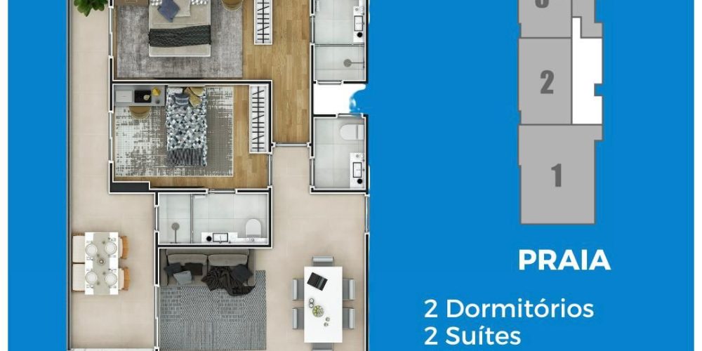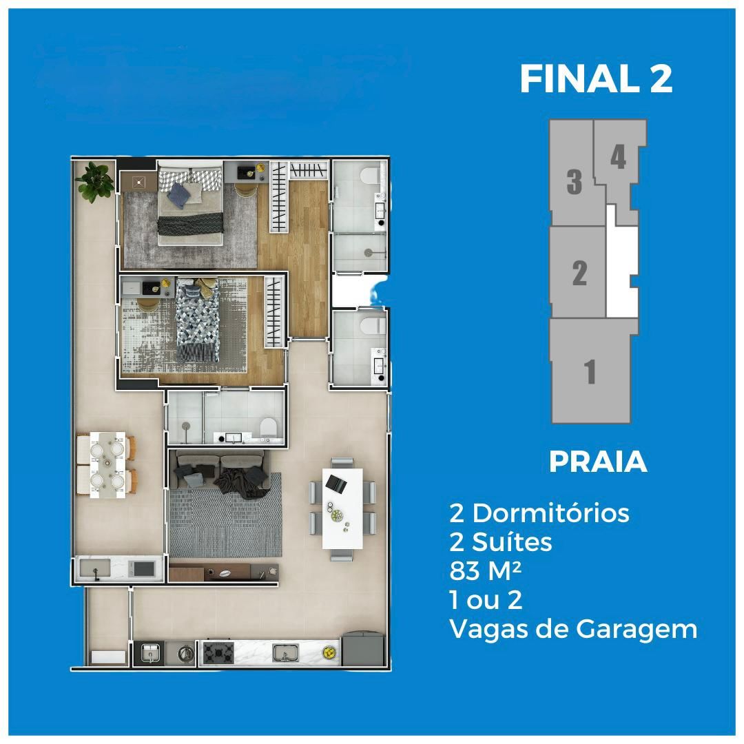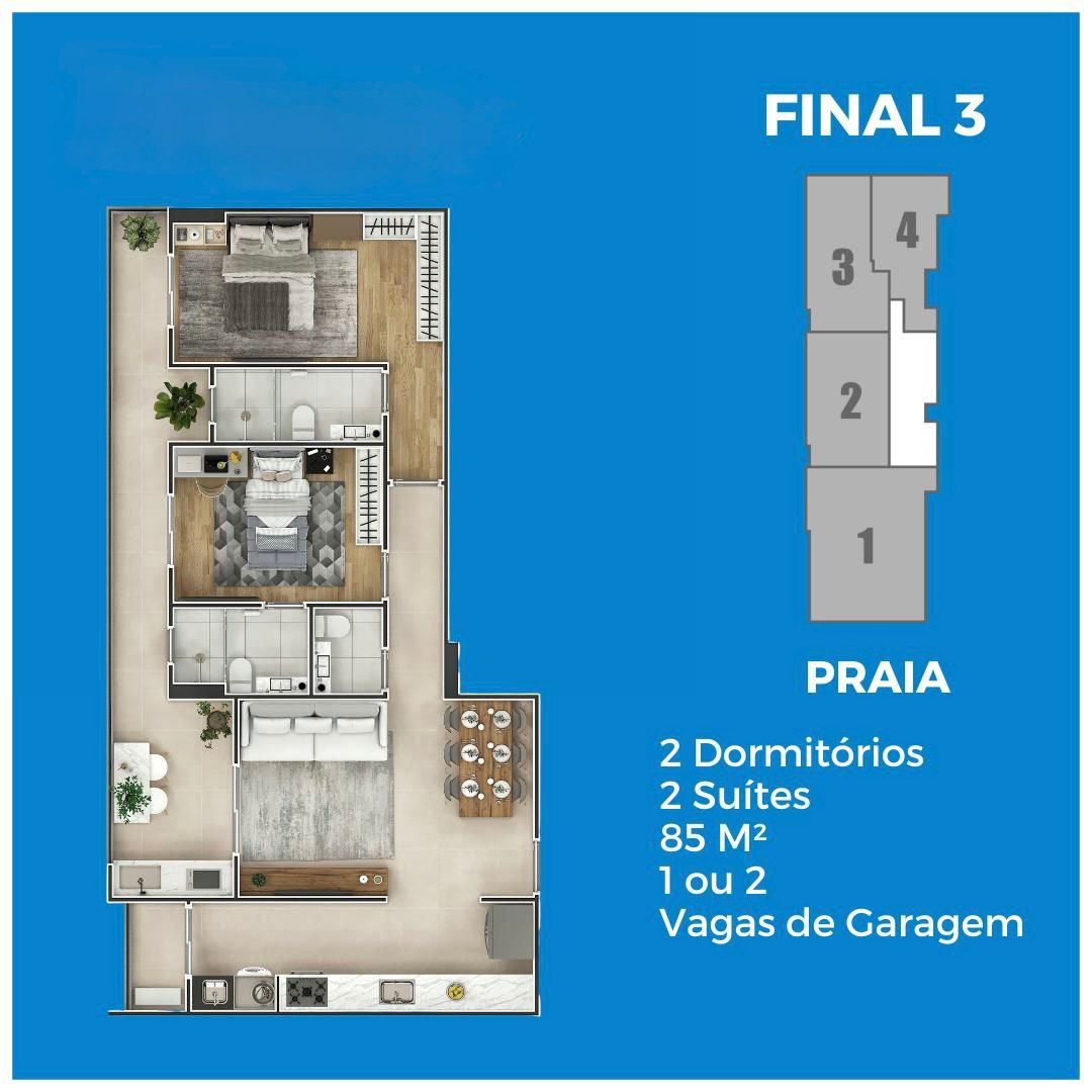 Empreendimento Frente Mar com apartamentos de 1, 2 e 3 dormitórios, de 65 a 136 m², com 1 ou 2 vagas de garagem.