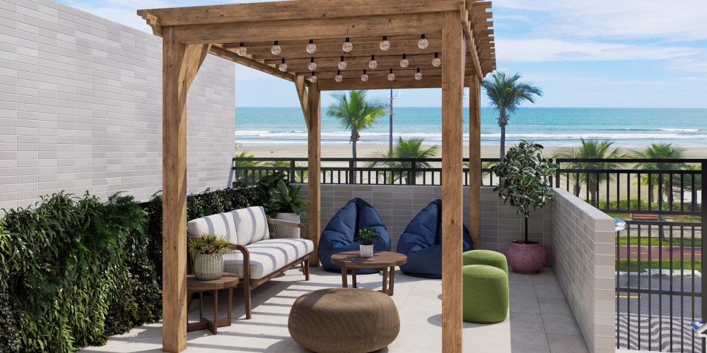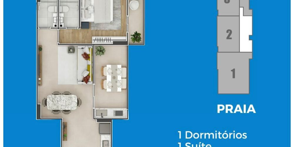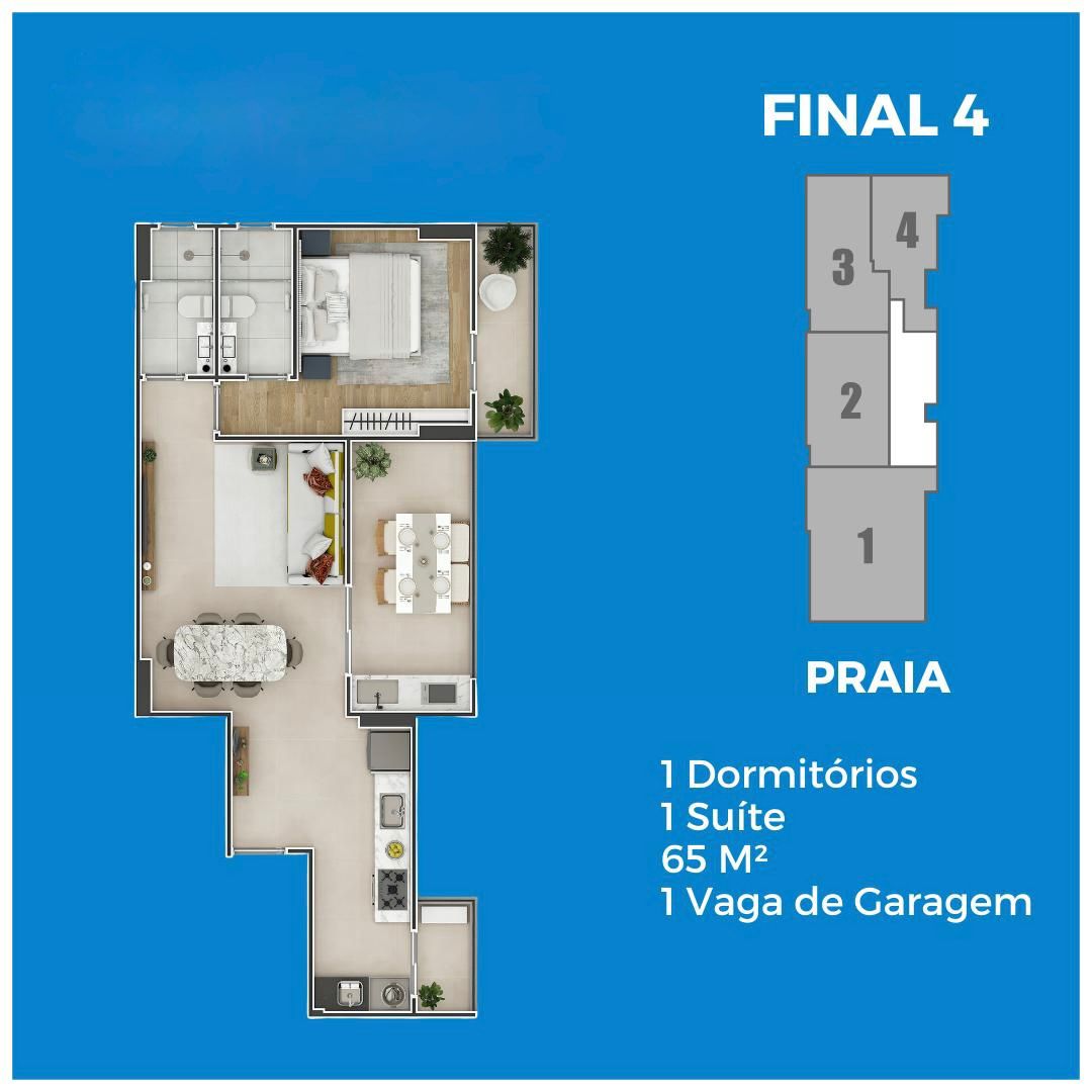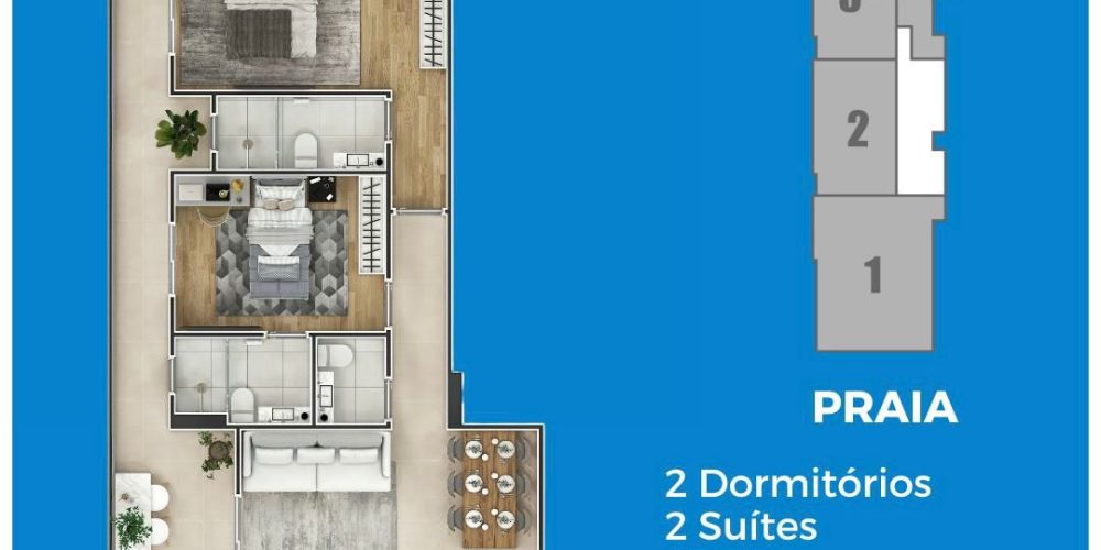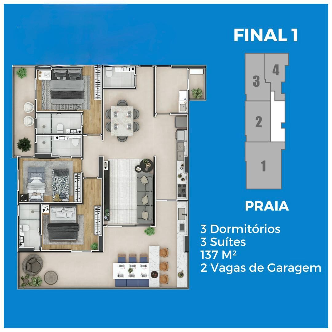 Empreendimento Frente Mar com apartamentos de 1, 2 e 3 dormitórios, de 65 a 136 m², com 1 ou 2 vagas de garagem.
