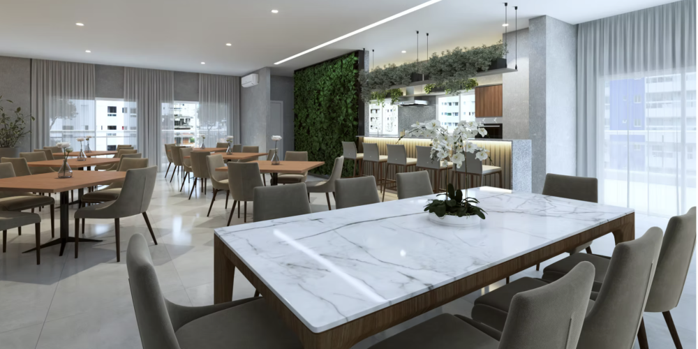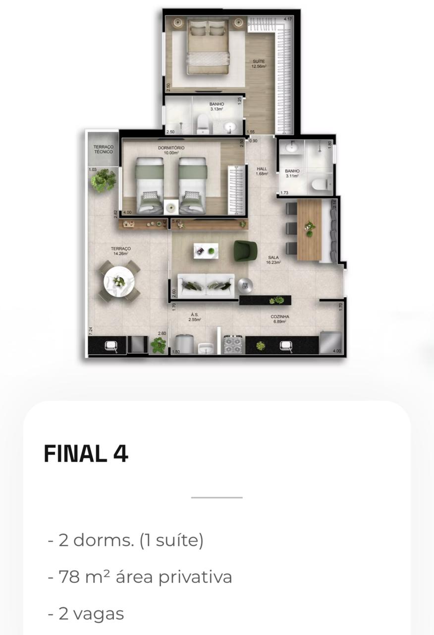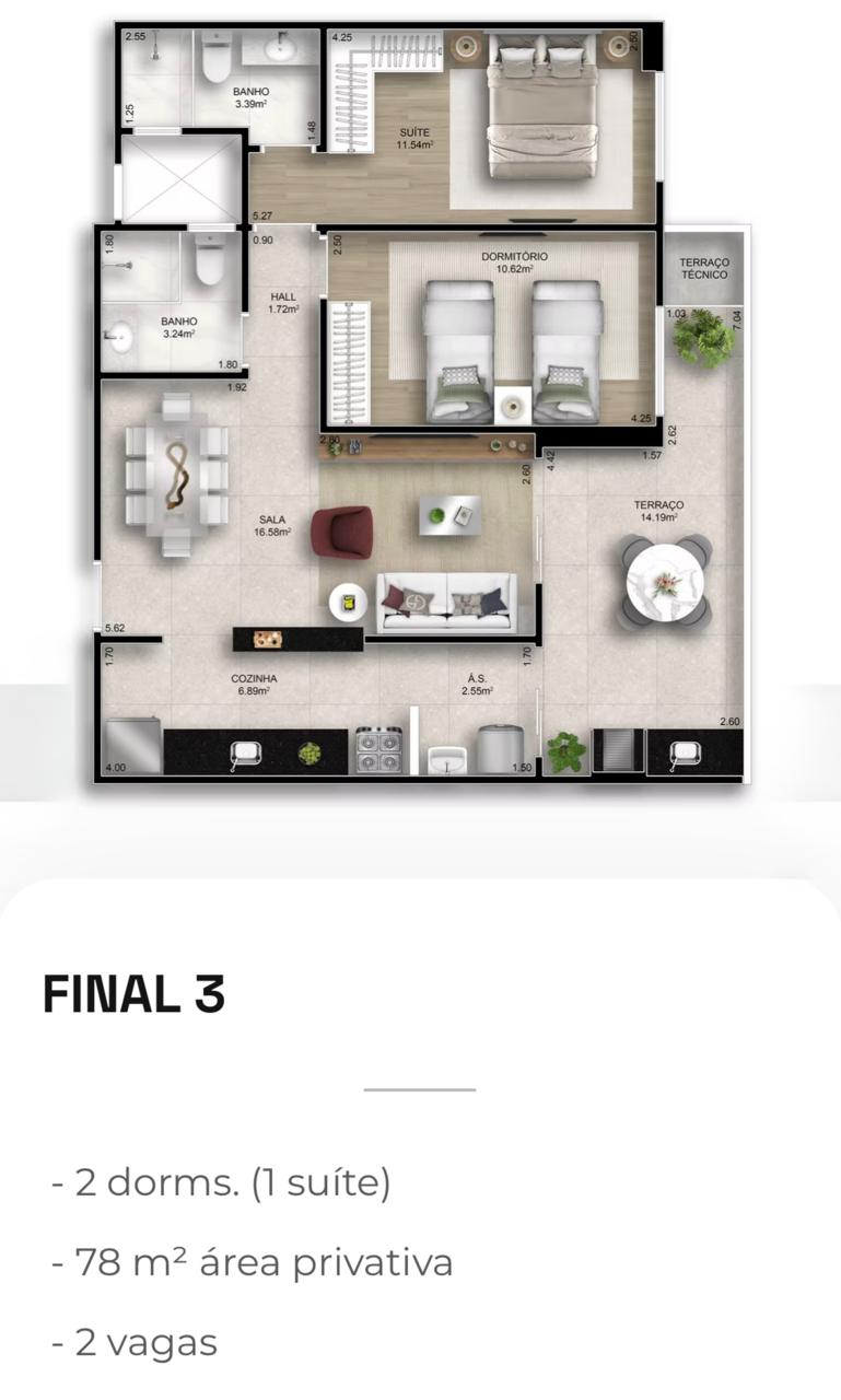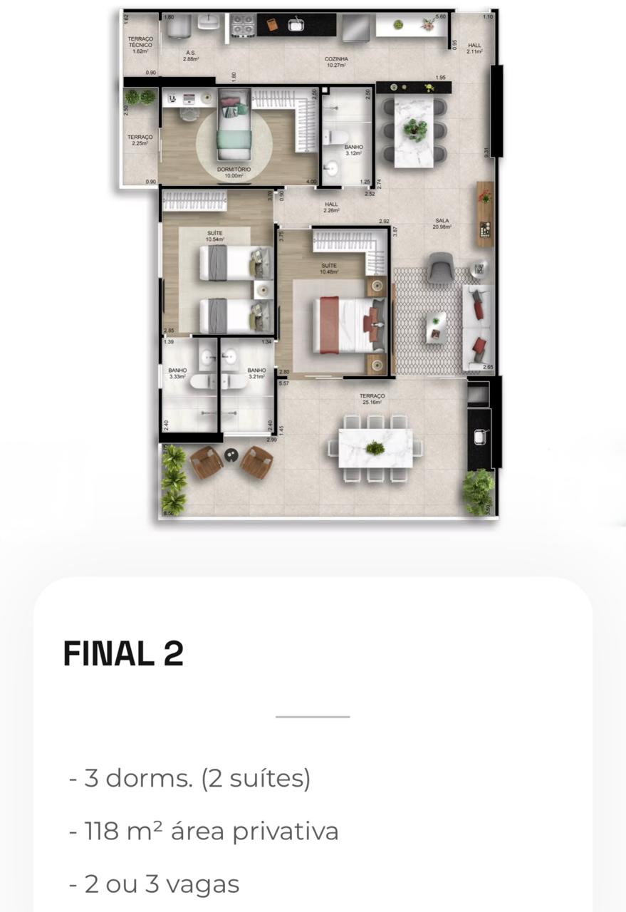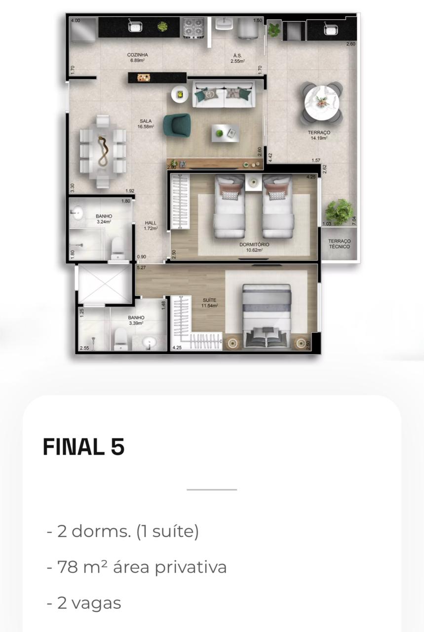 Empreendimento de torre única com apartamentos de 2 e 3 dormitórios, de 78 a 118 m², com 2 ou 3 vagas de garagem.